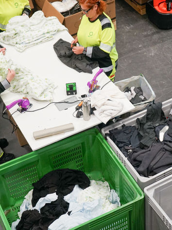 Vårt anlegg håndterer mottak prefabrikkering og sortering av tekstiler. Tekstilene gjennomgås nøye, og de som egner seg for materialgjenvinning, bearbeides og forberedes for videre prosessering. Samtidig utvikler vi løsninger for tekstiler som ikke kan materialgjenvinnnes og jobber kontinuerlig med forbedre sorteringsprosessen gjennom automatiserte systemer.